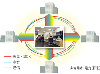 既に供給する冷水の水量や差圧など、お客様設備における制御弁などの開度情報をもとに、必要な圧力・水量を最小限とするスマート化による搬送動力の低減化を開始しています。また、今後は再開発に併せ、エリアに張り巡らされた地域洞道を活用して、冷水、蒸気・温水のみならず非常用水や電力のネットワークを順次構築し、エリア全体のエネルギーマネジメントにも積極的に取り組んでいきます。